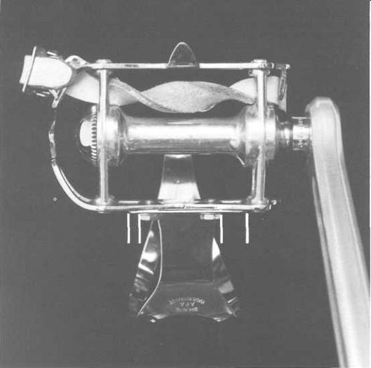 The saddle height adjustment recommended here is set up for optimum pedaling performance. During our interviews with many experienced cycling coaches we found no one who felt that a formula based on leg length should determine the proper seat height. Proper pedaling techniques are discussed in section 22 and the saddle height modifications required by varying pedaling styles are also covered. In the majority of cases, however, this method will be correct. As a further guide, the tip of the saddle will generally be approximately 6 inches from the top of the top tube if the frame has been sized properly. That will increase slightly for very tall persons and decrease slightly for short persons. STEP 3-Horizontal saddle adjustment (front and rear) This adjustment is one of the least understood in cycling. It is not used to correct for differences in top tube length or to make up for a handlebar stem that is too long or too short. The horizontal saddle adjustment is designed to accommodate varying styles of riding (dealt with in section 22) and differences in individual variance in thigh length. The height of the saddle corresponds to the overall length of the rider's leg-the horizontal saddle adjustment corresponds to the size of the rider's thigh. Some people have very long thighs and correspondingly short shins while others have very long shins and short thighs. In other words, the horizontal saddle adjustment is used to insure the proper angle of thrust of the leg. To set up the horizontal saddle position, sit on the bicycle with both feet in the toe clips. Rotate the cranks until they are parallel to the ground. Have a helper drop a plumb line from the center of your knee of the forward leg. The plumb line should extend through the pedal axle. Toe Clips The length of the toe clip is determined by the length of the foot. Usually toe clips come in three sizes: small, medium, and large. You can identify the size of the Christophe toe clip by the engraving on the top. The small toe clip is marked Christophe D; the medium is marked Christophe; and the large is marked Christophe Special. A rough guide (variations are discussed in section 22) is: Men's Shoe Size 5-7 8-10 11-13 Toe Clip Size small medium large Generally, the toe clip is the correct size if the ball of the foot is directly over the pedal axle. Men's sizes are the only ones listed here since bicycle pedals are one of the many bicycle components that are not designed for women. If the rule of placing the ball of the foot is maintained on the smaller woman's foot (ladies' shoe size 6.5 or smaller), a small toe clip would be too big! The disadvantages are not immediately obvious; however, they are discussed in section 22. When the toe clip is attached to the pedal (and the shoe cleat attached to the shoe), it should be adjusted so that the rider is pedaling slightly pigeon-toed. This results in a natural tendency to keep the knees close to the top tube which results in the most efficient pedaling motion and the least wind resistance. The reason for the pigeon-toed adjustment can be best demonstrated of f the bike. Stand with both feet parallel, 8 inches apart, with the knees bent. In this position the knees will be slightly apart. If the toes are moved outward (figure 20-4B), the distance between the knees will increase. If the toes are pointed inward, the knees will come together. Obviously the feet should not be severely angled. If the toe clips are positioned too far out on the pedals, the rider's ankles will frequently hit the crankarms. When the toe clips are inserted on the pedals, make sure that the buckle end is on the bottom so that the buckle does not rest on the side of the foot. Make sure that the strap has been twisted through the pedal (figure 20-5). This twisting eliminates strap movement each time the strap is tightened.