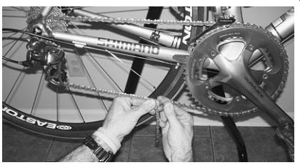 Replacement If the chain is skipping on the cassette, a replacement is overdue. Before you get to that point, you can use a chain gauge to determine whether the chain is worn, comparing your measurement against the manufacturer's specifications. If a new chain skips on the rear cassette when under strain, you waited way too long and the cassette will need to be replaced as well. Choose the correct chain. Eight- and nine speed chains are wider than ten-speed chains and are not interchangeable. To remove (or "break") the old chain, place it in the chain tool and turn the handle until the pin falls free. Clean the rest of the drivetrain before you install the new chain. Before installing the new chain, it must be sized, or broken to the proper length. If the old chain was the correct length, you can use it as a guide. Because it has elongated from use, you can count links or line up the two chains side by side and match them link for link. If you do not have the old chain or if its length was incorrect, route the new chain over the large chainring, through the front derailleur, over the smallest rear cog, and through the rear derailleur. Pull the two ends of the chain together beneath the chain stay until the rear derailleur pulleys are lined up vertically. Mark the chain and remove the excess, making sure you end up with a roller at one end and a pair of side plates at the other. The exception to this is if you will use a master link (discussed later), in which case cut the chain one plate short so you have two roller ends. There are two ways to join the ends of the chain. First, here's the method utilizing a chain tool and the connecting pin that's included with all new chains. Shift the front derailleur to the small chainring and remove the chain to the inside so it's draped over the bottom-bracket shell. This will release all tension from the chain, making it easier to work with. Bring the two ends together and place the pin, pointed end first, through the pin hole in the near side plate. Fit the two ends into the chain tool and screw down the handle, forcing the pin through the roller and into the far side plate. You will feel the pin ends snap into place. Remove the chain tool and use pliers to snap off the pointed end of the pin, then wiggle the newly joined link up and down to ensure that it moves freely. If a seven-, eight-, or nine-speed chain does not move freely, wiggle the link from side to side to loosen the connection. Don’t use this method with a ten-speed chain; it is too thin and the plate may come loose from the pin. Because of the difficulty of joining a ten-speed chain with a pin, I recommend using a master link instead. A master link also makes it easy to remove the chain for maintenance. Master links are designed to connect two roller pin ends by the use of pins connected to the plates of the master link. The master link consists of two plates that are designed to connect two roller ends of a chain. Each plate has one pin that is designed to fit through the roller and connect to a slot on the opposite plate. After connecting the chain, turn the pedals and watch the rear derailleur for any catches as the chain passes through the pulleys. If the rear derailleur jumps, the link is too tight and not operating smoothly. Loosen the link and repeat the installation.