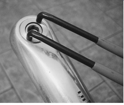 Bottom Bracket There are different types of bottom brackets, and we will look at only the two main types: cartridge style and outboard bearing bottom brackets. Both types of bottom brackets are manufactured with either English or Italian threads. English-threaded bottom brackets are reverse threaded on the drive side, so you must turn the bottom-bracket cup clockwise to loosen. Italian-threaded bottom brackets are "normal" threaded on both sides. If you have a proprietary bottom bracket, contact the manufacturer for detailed maintenance instructions. You will need a bottom-bracket tool de signed for your specific bottom bracket. Cartridge-style bottom brackets are manufactured with either splined or tapered spindles. To remove a cartridge-style bottom bracket, first remove the crankset. Next, remove the bottom bracket by loosening and removing the right side first. Next, remove the left-side bottom-bracket cup. Clean and grease both the bottom bracket and the shell. The bottom-bracket cups are marked right and left. Insert the left cup halfway, then insert the right side and tighten it. Return to the left side and finish tightening the left cup. Check that the spindle rolls smoothly, then reinstall the crankset. Outboard bearing bottom brackets don’t have a spindle and are designed to accept the spindle on integrated cranksets. Removal and installation follow the same procedures as cartridge bottom brackets. Headset Keeping the headset bearings clean and lubed prolongs their life. Due to the different styles of headsets and the specialized equipment necessary to remove the cups, service and inspection are covered here, but not removal and installation. When servicing your headset, pay close attention to where each part goes as you remove it. To service the headset you must first remove the stem. Start by completely removing the top cap and bolt, loosening the stem bolts, and pulling out the stem. Assuming that the brake and shifter cables are still installed in the levers, place a rag on the top tube to protect against scratching the finish when you rest the stem and handlebars on the top tube. Push the fork down 1 to 2 inches, then push it back up. The compression washer and cover should come back up with it; remove them from the fork, then pull out the fork. If the fork is stuck, tap it out with a rubber mallet, or place a block of wood on top of the steerer tube and tap it out with a hammer, using caution if the fork has a car bon fiber steerer tube. Inspect the upper and lower bearings for wear. (If the bearings are pitted, the headset must be replaced.) Clean the old bearings with degreaser and allow them to dry.