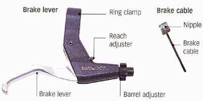 Parts of a Brake Lever and a Brake CableImage (right) shows: Brake lever, Brake cable, Nipple, Brake cable, Brake lever, Barrel adjuster